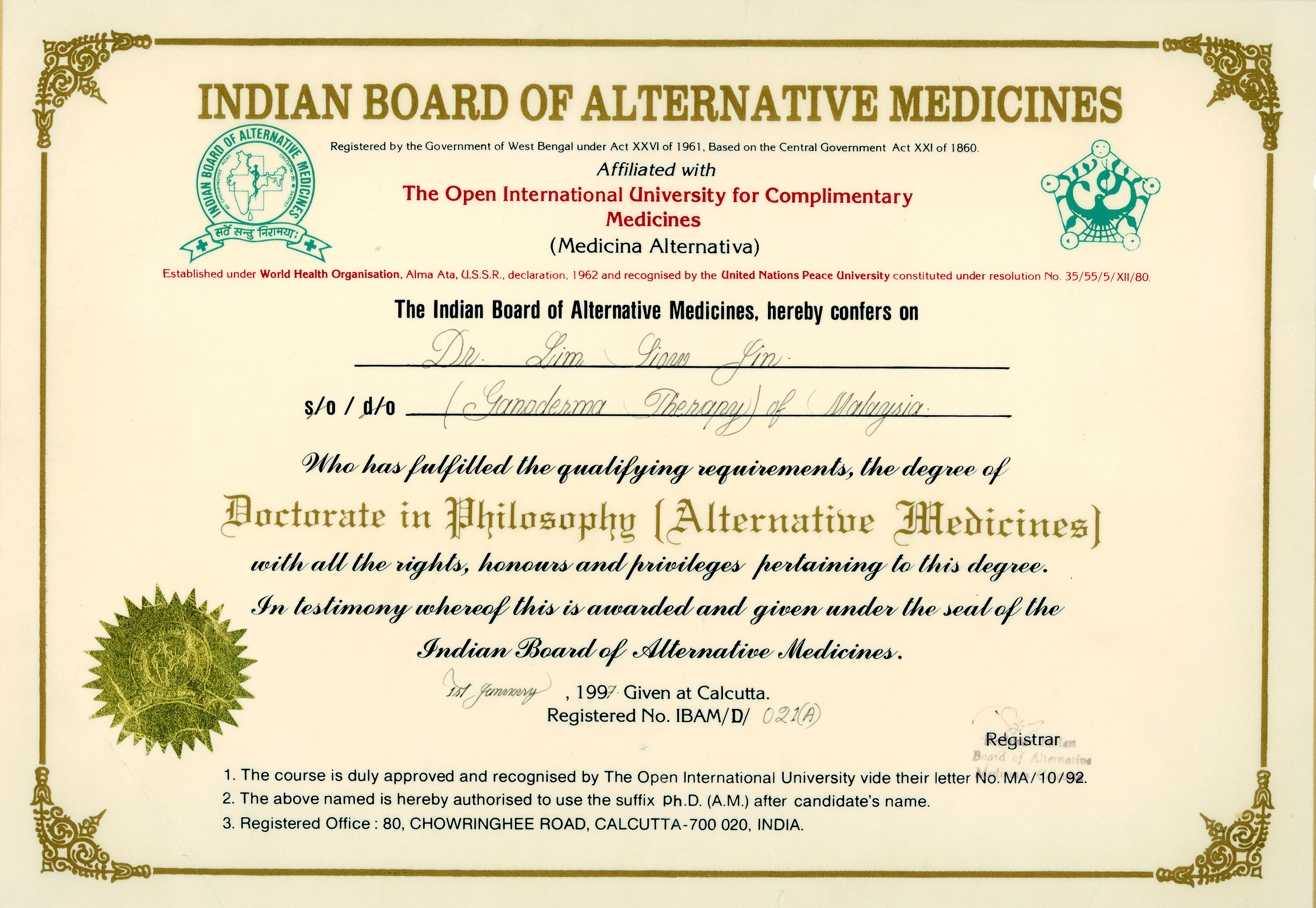 He also received the Certificate of Appointment as Senior Visiting Professor (Natural Healing & Ganotherapy) from the Open International University for Alternative Medicines and Certificate of Fellowship from the World Health, Environment and Peace Foundation.