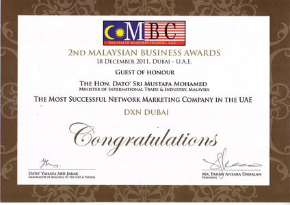 DXN was awarded The Most Successful Network Marketing Company in The UAE in the 2nd Malaysia Business Awards organized by Malaysia Business Council UAE. The Award was presented by YB Dato' Sri Mustapa Mohamed, Minister of International Trade & Industry, Malaysia on 18th Dec 2011 in Dubai.