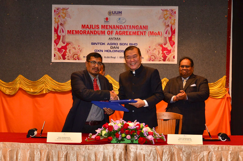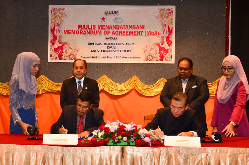 Memorandum of Agreement (MoA) between DXN Holdings Bhd and Sintok Agro Sdn Bhd on sustaining the Agroforestry in Kedah and promoting the Herbalogy related courses endorsed by local universities has been signed on 17th January 2018.